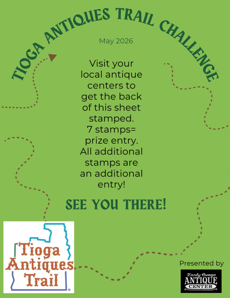 Website https://www.facebook.com/share/1JScc1M84a/ Location Early Owego Antique Center Corner of Lake and Main Street Owego, NY 13827 Contact Name: Layla Etienne Throughout the month of May, visit the Tioga Antiques Trail for a chance to win the grand prize! Get Directions using Google MapsSend Email to Event ContactF4C0841C-D6A2-42C6-92EC-9F06B86017CF